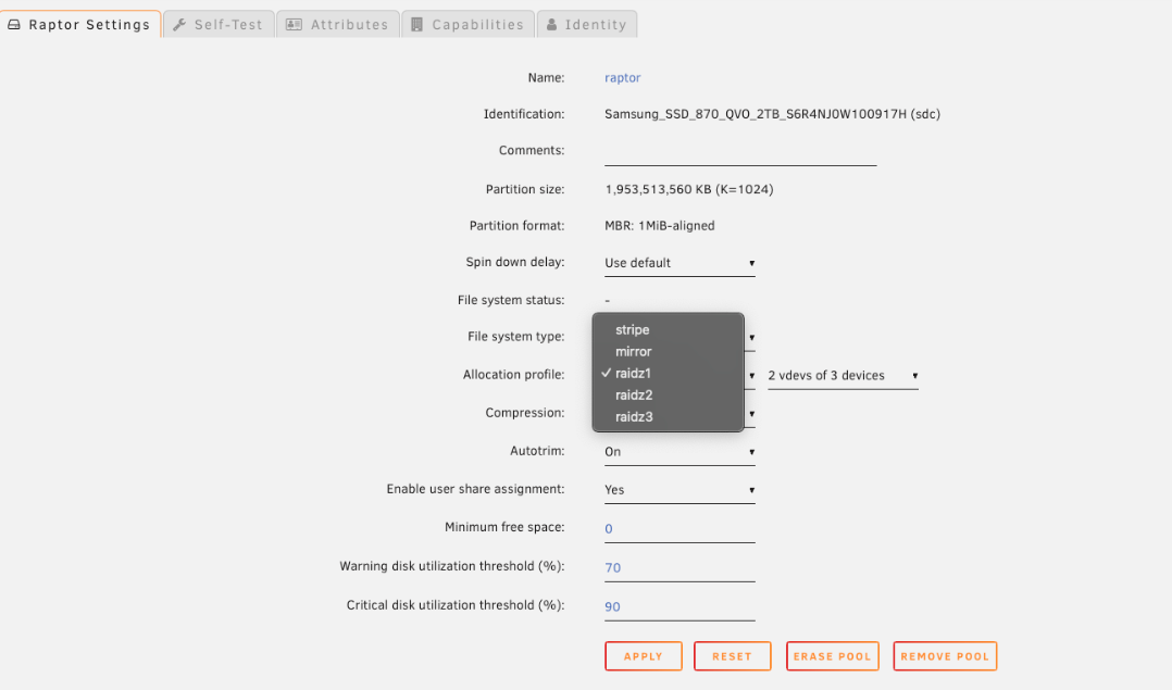 raptor)。 - 设置槽位数量以匹配您想要在主数据 vdev(s) 中的磁盘数量。